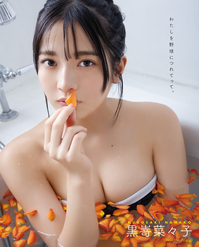 一方、裏表紙は黒嵜菜々子が飾る。いつもより大人っぽく、セクシーな雰囲気の最新ビキニグラビアを披露。おしゃれな花柄ビキニに紫の羽織を合わせたしっとりとした姿や、ペパーミントグリーンのワンピース水着で美しいボディラインを見せる。さらに、ブラックに白のパイピングがアクセントのチューブトップビキニで花びらとともにバスタブに浸かるショットなど、現在の黒嵜菜々子の魅力を凝縮した15ページのロンググラビアとなっている。