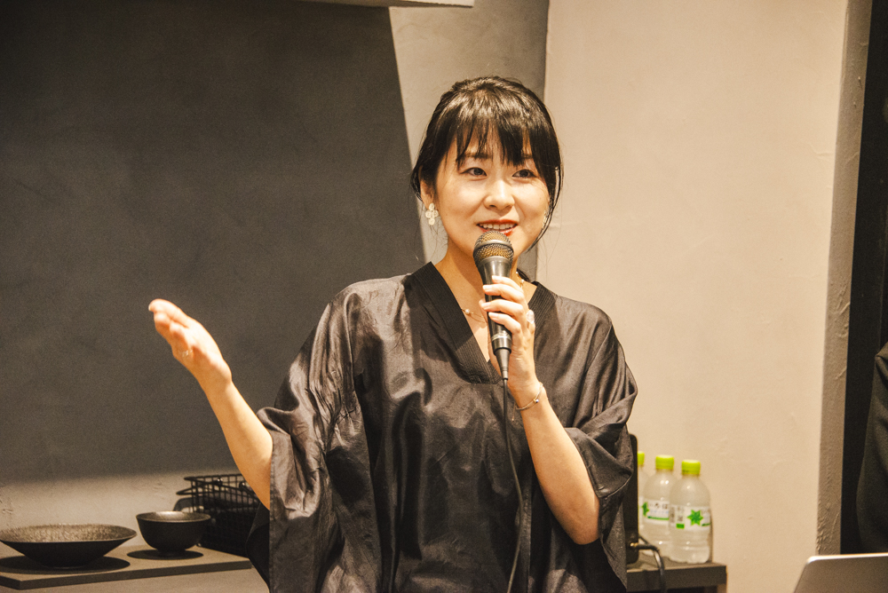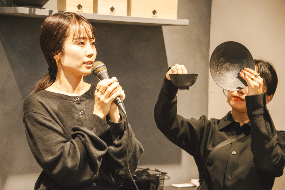 商品開発では、京都の伝統的な紋付袴の染色技法を用いたシンクロタオルや、漆黒を表現した器シリーズなど、独自性の高い商品を展開。山本事業室長は「ただ見た目が黒いというところで集めているわけではなく、その商品に語れる黒のポイントがあるかというところを大事に商品開発しております」と商品開発の方針を説明する。